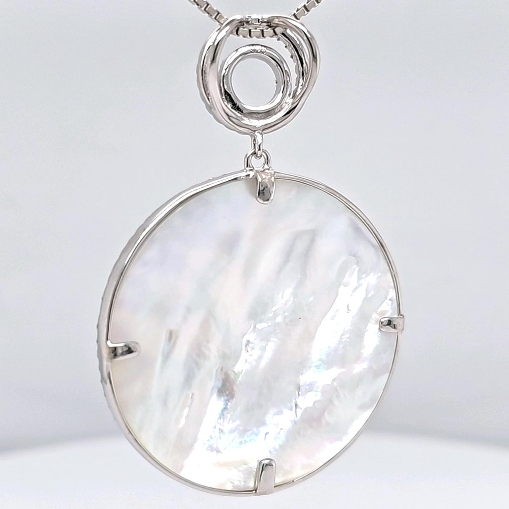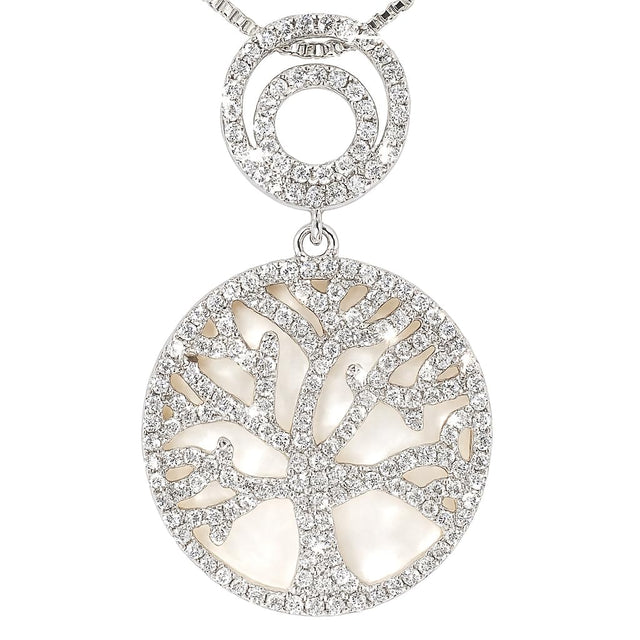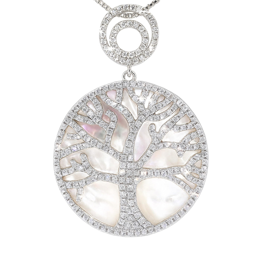Embrace spiritual elegance with this radiant Tree of Life pendant necklace, expertly crafted in solid sterling silver. Measuring 35mm from top to bottom and 31.3mm radius. Weighing 4.9 grams, this statement piece features a stunning mother of pearl background that beautifully reflects light beneath the detailed branches of the symbolic tree. The design is adorned with 0.8mm round AAA-grade cubic zirconia stones for a soft yet captivating sparkle. This pendant symbolizes growth, grounding, and eternal life making it a heartfelt gift or a meaningful addition to your personal jewelry collection.