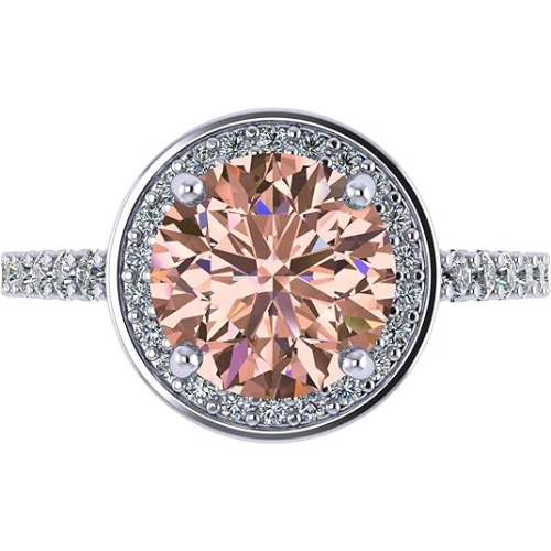 This beautiful peach color 8mm Simulated Morganite Pure Brilliance Zirconia is set in a classic Halo Engagement Ring design. This 'Halo' style engagement ring features 60 accent stones to enhance the beauty of this 8mm simulated Morganite center stone.. It is set in precious Sterling Silver, then plated in your choice of Platinum (white finish), or Yellow or Rose Gold, and is available in finger size 5 to 10. The center stone is approximately 8.00mm which makes that equivalent to an approximate 2 ct Diamond.