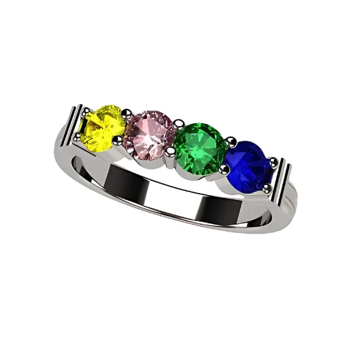 - Shared Prong Set Faceted with your choice of 1 to 6 Round Brilliant-Cut Simulated Birthstones in the middle with a grooved design on bright polished flat edging. This ring is dainty and attractive.