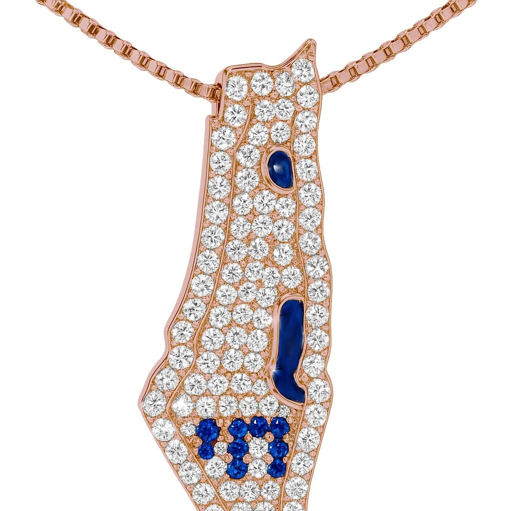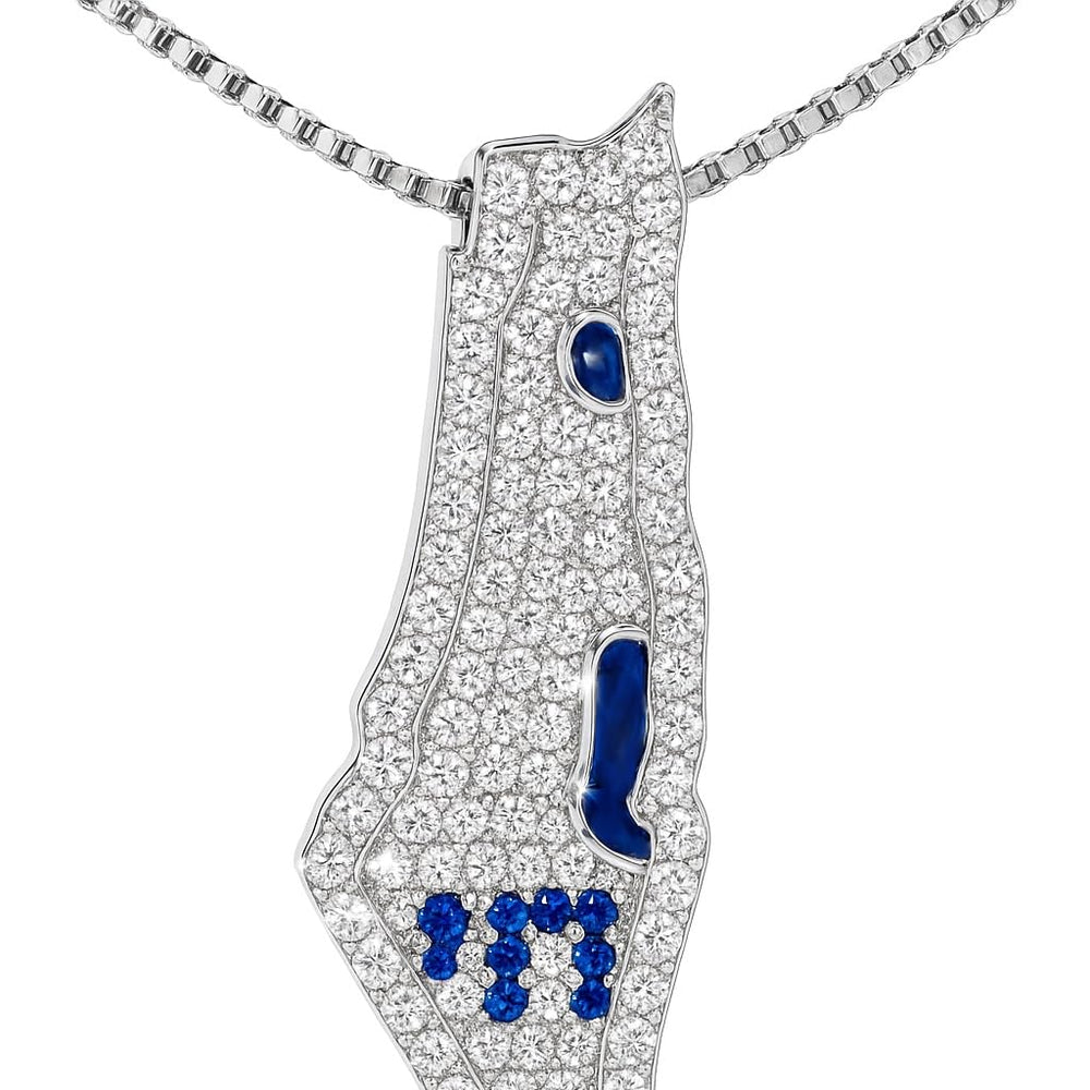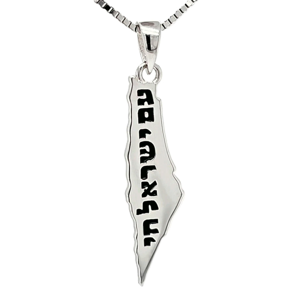 - The Israel Map Necklace stands as an enduring symbol of Jewish heritage. Crafted with care, it bears the vertical Hebrew letters of "Am Yisrael Chai," proudly displaying your faith. This intricately designed piece, depicting the map of Israel, is meticulously fashioned from 925 sterling silver. Available in white, yellow, and rose gold-plated finishes, it's a fitting gift for any supporter of Israel, blending elegance with devotion.