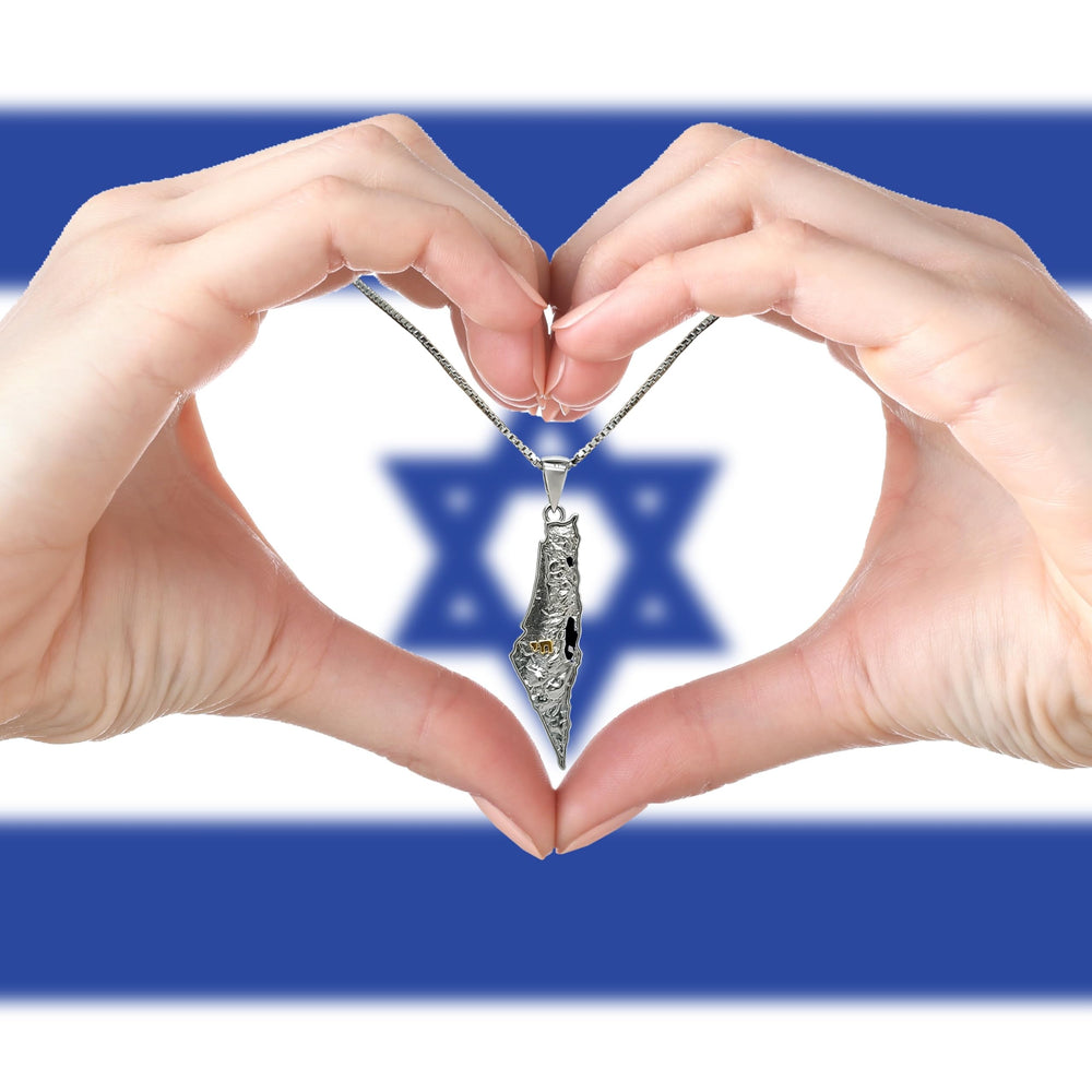 - In sterling silver's gleam, an Israel map unfolds, A pendant of pride, in tales yet untold. Jewish heritage, in each contour traced, In Hebrew jewelry, our roots embraced.The Holy Land's map, a symbol profound, In Judaica necklaces, its essence found. A charm of Israel, worn with delight, A symbol of faith, shining so bright.From border to border, its geography shown, In silhouettes crafted, its beauty known. For men and for women, a necklace divine, A gift of the heart, forever a sign