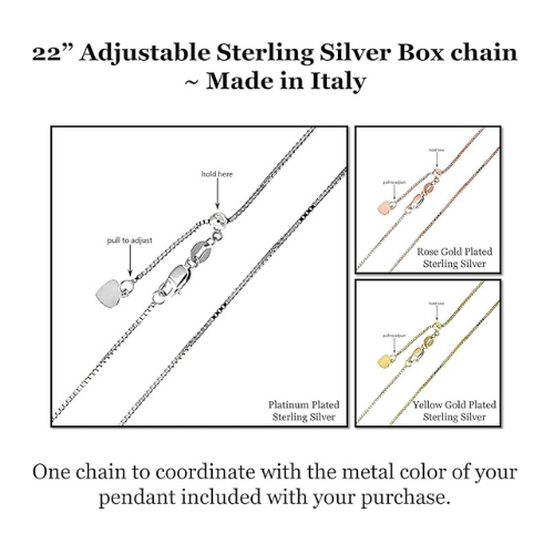 3. Comes with a sterling Silver 0.80mm, 22" Adjustable Box Chain, Platinum Plated, Yellow or Rose Gold Plated.