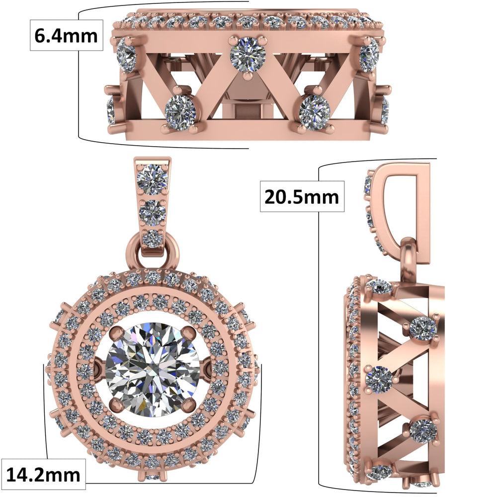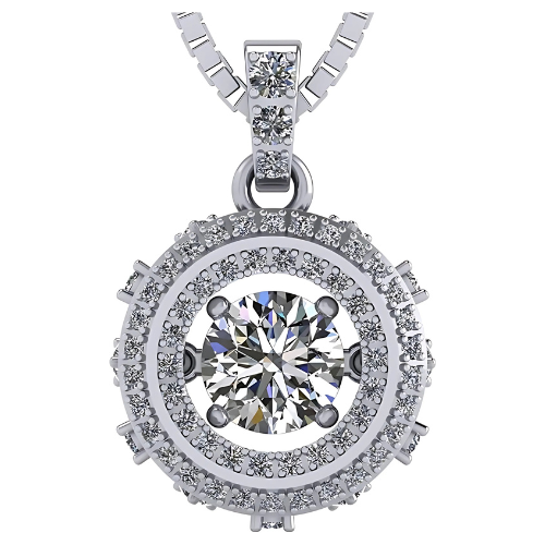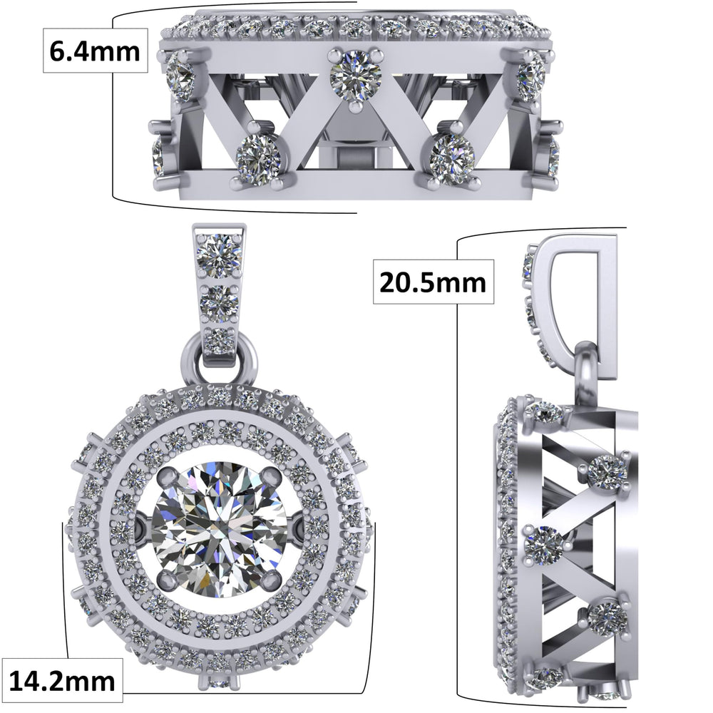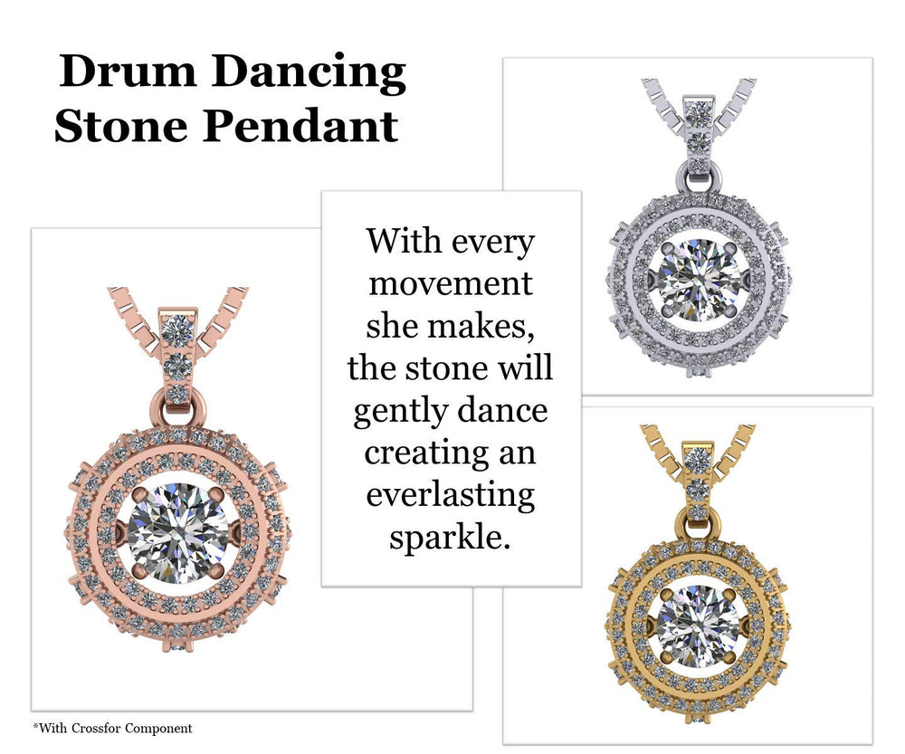 The "Dancing Stone" is a revolutionary patented mechanism allowing the center stone to continuously move, and sparkle, with the smallest movement. It will also move with the beat of her heart. The center stone is Pure Brilliance Zirconia and is suspended from two fine points and is designed so as to not touch the body but continually move in a vibrating fashion. This beautiful pendant is made from .925 sterling silver and comes with your choice of Platinum Plated, Yellow or Rose gold plated. It Includes .8mm 22-inch Adjustable Box Chain. This beautiful Pendant weight Approximately 5.3gr including the chain. It has one Round CZ in the center that measure 6.0mm, one-2mm, 12-1.7mm, 1-1.3mm and 55-1.00mm Round Cubic Zirconia set in a in a Drum Shape around the center stone. It measures 14.2mm wide, 20.5mm tall including the Bail, and 6.4mm Thick. Please view CAD image on this listing for more information. You will love this beautiful piece. It is manufactured according to our high quality standards.