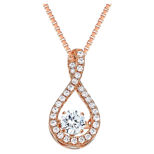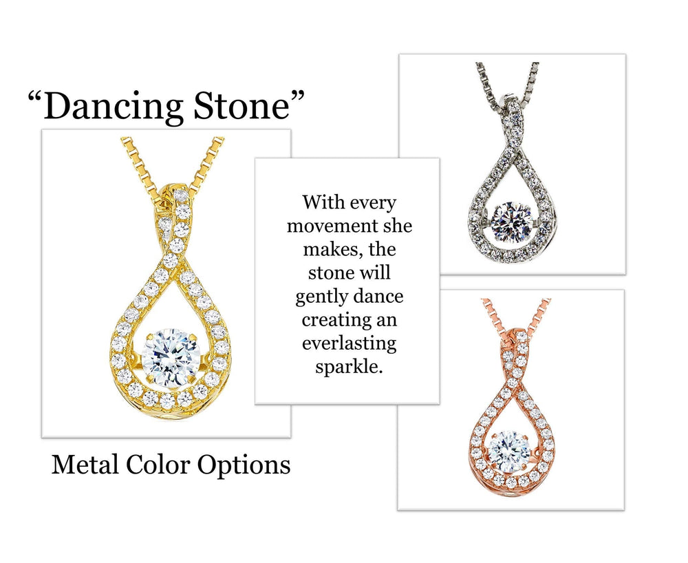 2. “With every movement she makes, the stone will continue to dance creating an everlasting sparkle.” The Dancing Stone is a revolutionary patented mechanism allowing the center stone to continuously move, and sparkle, with even the smallest movement. The center stone is Pure Brilliance Zirconia. It is suspended from two fine points and is designed to not touch the body and continually move in a vibrating fashion. This looks like a diamond pendant necklace and is a great love necklace.