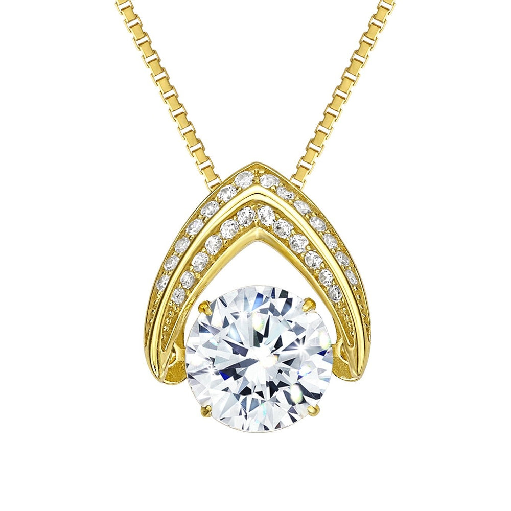 - This beautiful pendant is made from .925 Sterling Silver plated in your choice of Rhodium, Yellow Gold, or Rose Gold. It has one Round Pure Brilliance Zirconia in the center measuring 7.5mm in diameter and surrounded by Round Pure Brilliance Zirconia Accent Stones. Center stone has the look of a 1.50ct Diamond. Genuine Components. Sparkly Moving Pure Brilliance Zirconia.
