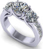 Ultimate luxury Past present future ring, Three Stone ring with side accent stones is made with Pure Brilliance Zirconia. This is the original Past present future ring Three stone engagement ring. It is called Lucita (trellis) style and have a Euro Shank. This engagement ring Style is made of Platinum Plated over Sterling Silver. Center stones is 6.5mm, the two sides are 5.0mm each and the eight stones on the shank are 2.5mm each. 3 Stone rings are very popular. They are used as engagement ring sets. An engagement ring is a ring indicating that the person wearing it is engaged to be married, especially in Western cultures. In Western countries, engagement rings are worn mostly by women, and rings can feature diamonds or other gemstones. In some other cultures men and women wear matching rings. In some cultures, engagement rings are also used as wedding rings. The woman's ring is presented as an engagement gift by a man to his prospective spouse while he proposes marriage or directly after she accepts his marriage proposal. It represents a formal agreement to future marriage. In Western countries, it is customarily worn on the left hand ring finger, though customs vary across the world.